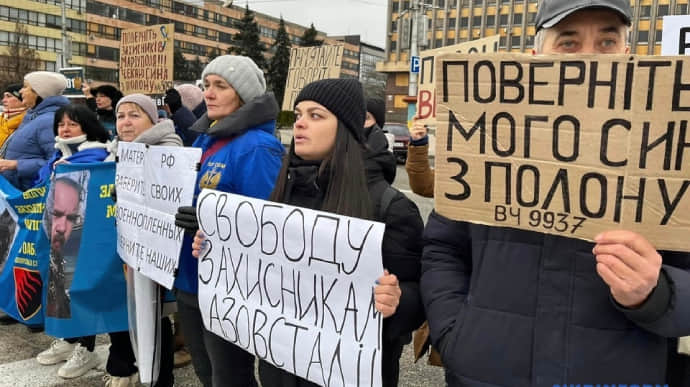 У Запоріжжі близько 200 рідних та близьких полонених захисників Маріуполя вийшли на акцію, аби привернути увагу суспільства та зрушити з місця процес обміну. Таку ж акцію провели у Києві.