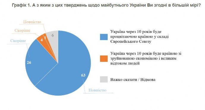 Натомість лише 5% респондентів мають песимістичні очікування, що через 10 років Україна буде спустошеною країною з відтоком людей".