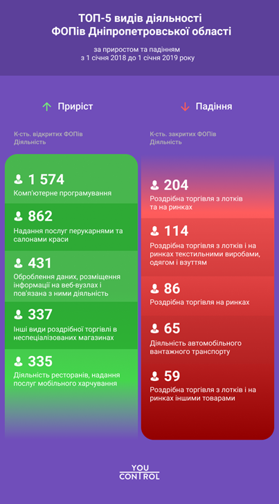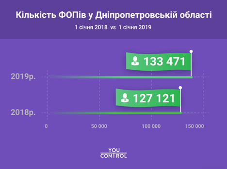 На 1 січня 2019 р., за даними аналітиків системи для перевірки контрагентів YouControl, в Україні налічувалося 1,91 млн дрібних підприємців, з них 133 тис. припадає на Дніпропетровську область. Звичайно, за рік ФОПи як відкривалися, так і закривалися. Протягом 12 місяців на Дніпропетровщині було зареєстровано понад 20 тис. фізичних осіб-підприємців, а ліквідувалося – 13,7 тис., що дало в підсумку загальний приріст в регіоні.