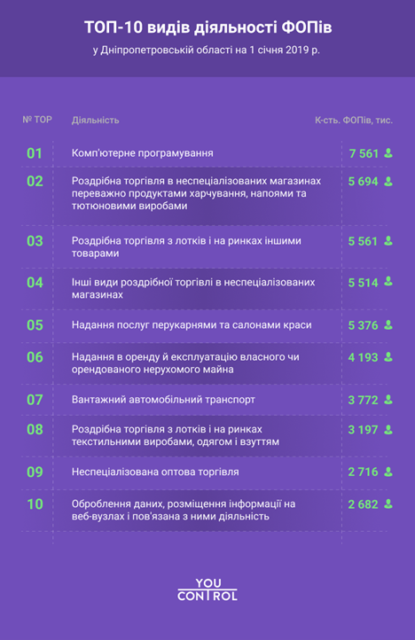 Зі всіх ФОПів, що працюють у Дніпропетровській області, найбільше – 5,7% – зареєстровані за видом діяльності “Комп’ютерне програмування”. Далі за кількістю ФОПів йдуть такі види діяльності, як “Роздрібна торгівля в неспеціалізованих магазинах переважно продуктами, напоями та тютюном” та “Роздрібна торгівля з лотків і на ринках іншими товарами”. На них припадає близько 4,2% на кожен. Інші категорії, що потрапили в ТОП-10 КВЕДів, отримали від 2% до 4,1%.