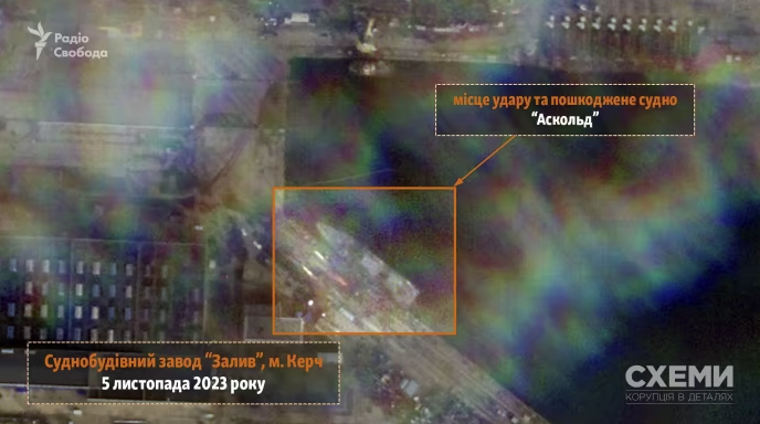 На знімках Planet Labs за 5 листопада помітно місце ураження на заводі та військове судно, яке також виглядає пошкодженим.